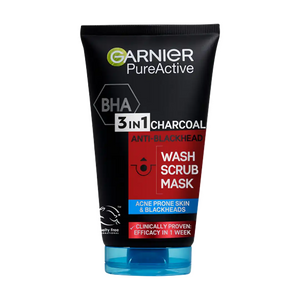 Garnier Pure Active 3-In-1 Wash, Scrub & Mask 150ml fights the appearance of blackheads and oil in three different ways. As a face wash, it cleanses and removes impurities. As a scrub, it gently exfoliates skin and unclogs pores. As a mask, it absorbs excess oil and mattifies the skin.