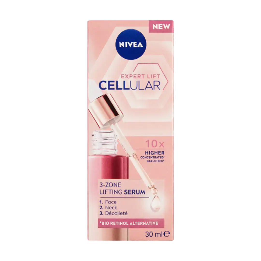 Nivea Expert Lift Cellular 3-Zone Lifting Serum 30ml visibly reduces wrinkles and lifts the face and neck for a tighter, more youthful appearance. This anti-ageing and firming formula for all skin types contains a high concentration of pure bakuchiol, ensuring tightness and elasticity. It is the perfect gift for mum.