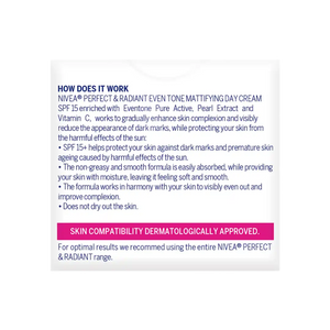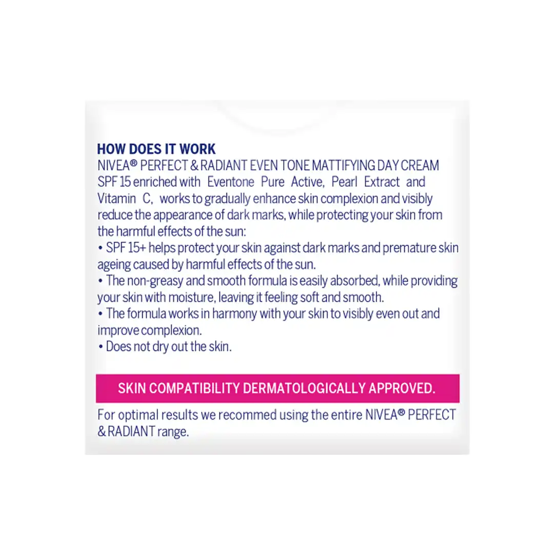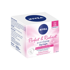 Nivea Perfect & Radiant Facial Day Cream 50ml is specially made with eventone pure active and vitamin E to help even out the skin tone and prevent dark spots from appearing for a radiant complexion. Added SPF15 to protect skin from sun damage.