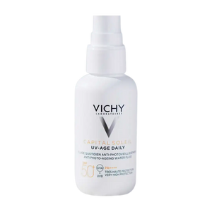 UV-AGE DAILY is the 1st anti-photoaging fluid from Vichy. Its multi-patented Netlock technology forms an ultra-thin, ultra-resistant and invisible UV protective film on skin for a very high protection against UVB and UVA rays, responsible for more than 80% of ageing signs. It is enriched with anti-ageing derm actives, Peptides and Niacinamide, to visibly correct photo-ageing signs: dark spots, lack of plumpness and dullness's).