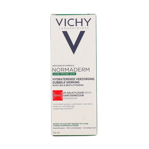 Vichy Normaderm Phytosolution Double Correction Daily Care Moisturiser. It is a hydrating moisturiser to for oily blemish prone skin. This lightweight cream is easily absorbed and targets imperfections whilst revitalising and hydrating skin for up to 24 hours. Enriched with dermatological ingredients including salicylic acid to exfoliate, hyaluronic acid to enhance skin hydration, probiotics and Vichy Mineralizing Thermal Water, rich in 15 minerals to boost antioxidant defences. In addition to protecting the skin barrier and controlling excess oil, the salicylic acid moisturiser leaves skin looking smoother and more radiant. Dermatologically tested. Hypoallergenic and suitable for sensitive skin.